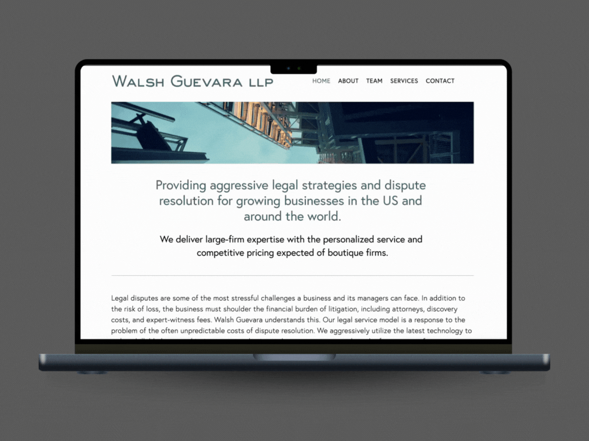 The partners of Walsh Guevara LLP came together to start their law firm to offer clients a new kind of legal service model in response to the typically unpredictable costs of business dispute resolution. Both partners brought an impressive background to their new venture, and it was important to them that their law firm branding and website design reflect their legal expertise while keeping the timeline and marketing cost reasonable for their stage of business.
